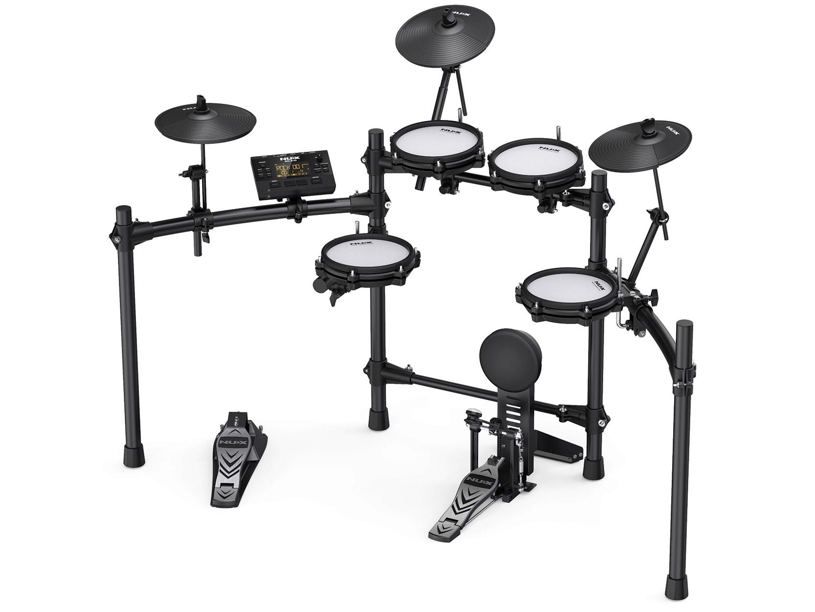 Complete digital drum kit with mesh pads on an adjustable rack, dual triggers for realism, touch-sensitive hi-hat, crash, ride zones, and a bass drum with pedal. Includes 15 sounds, reverb, recording, metronome, Bluetooth, and headphone output for versatile practice and performance.