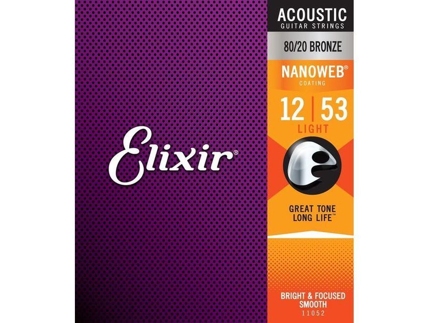 Elixir Strings 80/20 Bronze Acoustic Guitar Strings with NANOWEB Coating, Light (.012-.053) | E11052 Acoustic guitar strings constructed with 80/20 (80% copper, 20% zinc) bronze wrap wire Played for a bright tone with an expressive, vibrant presence NANOWEB Coating provides a smooth feel Light